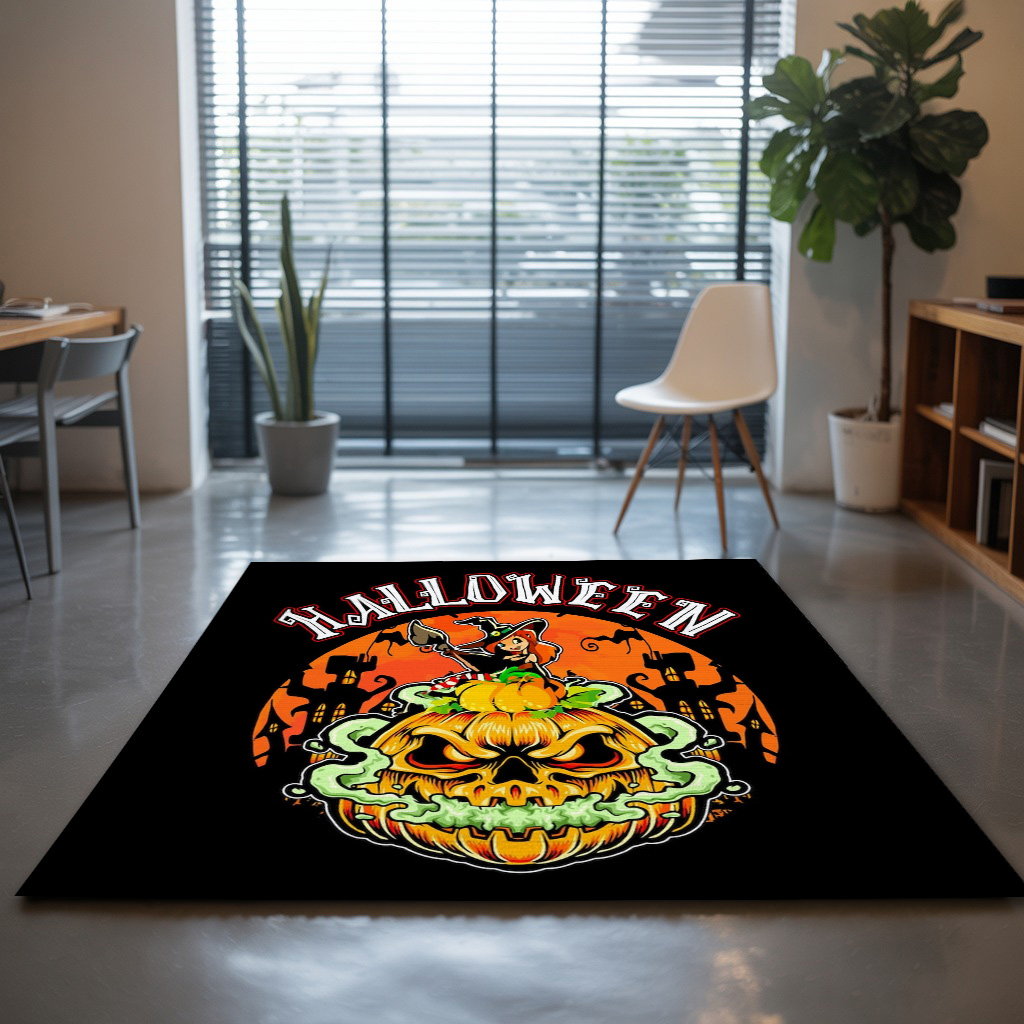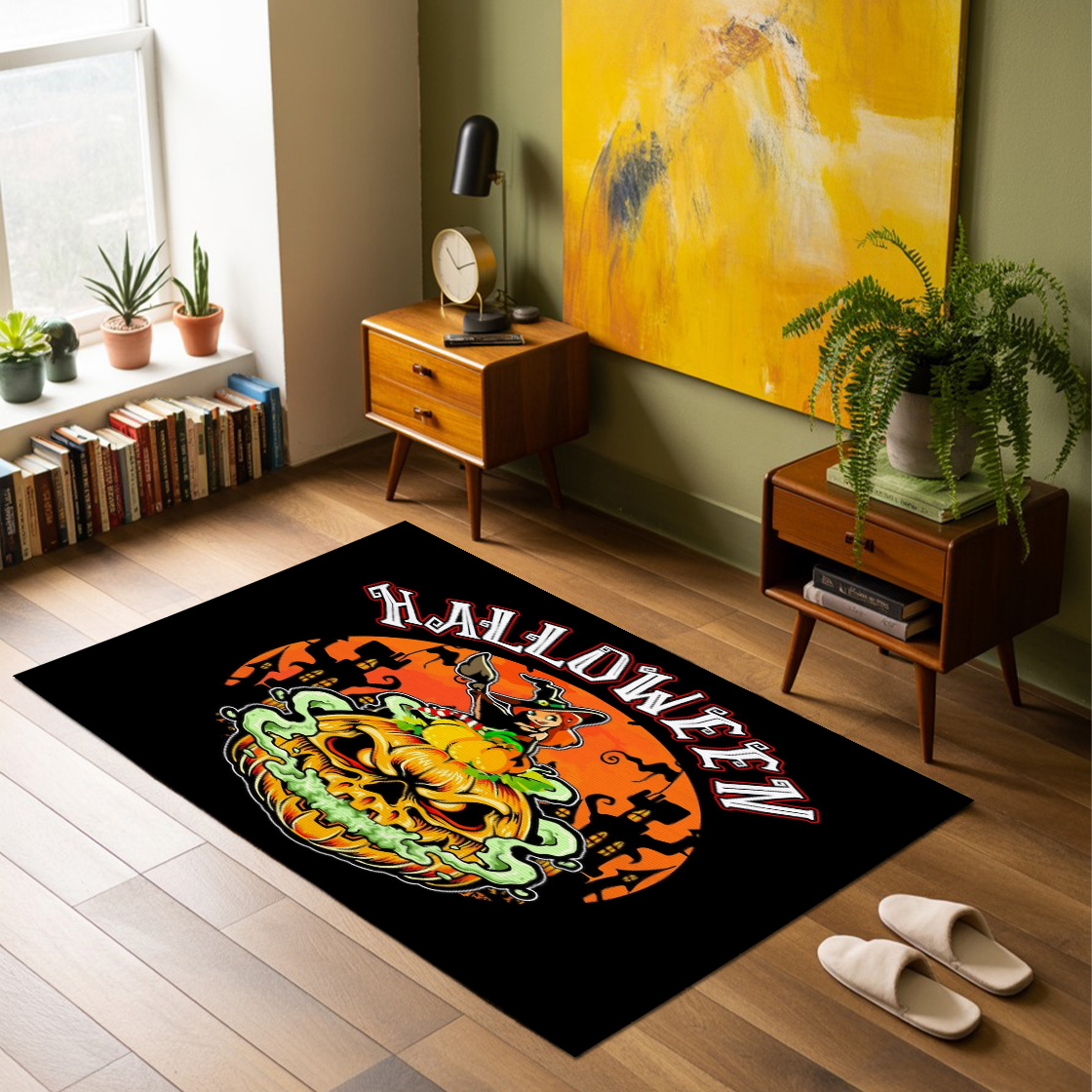 Cute Witch Pumpkin With Cat And Bat Cartoon Rug
